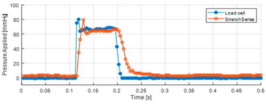 The temporal signals during one piston stroke are presented for the load cell and capacitive sensor in Figure 12. A sharp peak is noted at the start of the signal, which is attributed to the initial impact of the piston against the sensors. This impact is disregarded in the analysis. In order to allow for a comparison between the load cell and the StretchSense measurements, the capacitance was converted to pressure using a linear curve fit as the calibration. As shown in this figure, the magnitudes of the calibrated StretchSense signal and the load cell are in good agreement. The negligible 10–20 ms latency in the capacitive sensor measurements is expected, given the data smoothing done by the measurement circuit board.