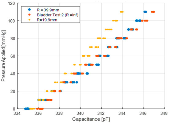 The sensitivity to curvature of the capacitive sensors is shown in Figure 13 for a variety of pressures. The curvature clearly influences the sensor capacitance when subject to pressure. The sensitivity of the sensor was found to be 0.0812 pF/mmHg and 0.106 pF/mmHg for radii of curvature of 19.9 mm and 39.9 mm, respectively. From the bladder test, the sensitivity on a flat surface (infinite radius) is 0.100 pF/mmHg. As shown in this figure, the sensor sensitivity decreases as the radius of the curvature decreases, i.e., the sensor is more curved. This sensitivity to curvature may potentially impose limitations in the sensor calibration when mounted on a flexible object of variable curvature, such as a calf muscle. This can be mitigated if the sensor is securely placed against a rigid plate of fixed curvature attached to the user. The sensors may then be calibrated where the plate closely fits a person’s local body shape during in-situ measurements. Of course, a rigid plate changes the pressure loading experienced by the compression user.