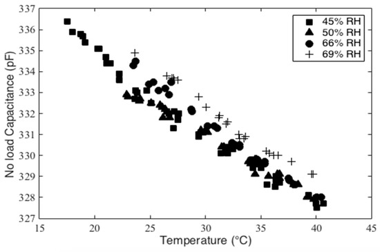 Further tests were performed to characterize the offset by measuring the capacitance under the no-load condition while varying temperature and humidity. The sensor was placed on a Peltier module, which acts as a hot/cold plate in order to control the sensor temperature. The capacitance was then measured at several ambient humidity and temperature values, as shown in Figure 15. Using the experimental results shown in this figure, the sensor’s temperature sensitivity, or thermal coefficient, was found to be approximately −0.38 pF/°C, and the humidity sensitivity was measured to be −0.345 pF/%RH. This relates to approximate pressure errors of 4 mmHg/°C and 4 mmHg/%RH. These tests indicate that both the temperature and humidity have noticeable effects on the sensor’s output. Thus, the variances in the bladder test results are likely attributed to the differences in the temperature and humidity conditions during these tests. It was noted, however, that the ambient conditions were not recorded prior to bladder testing.