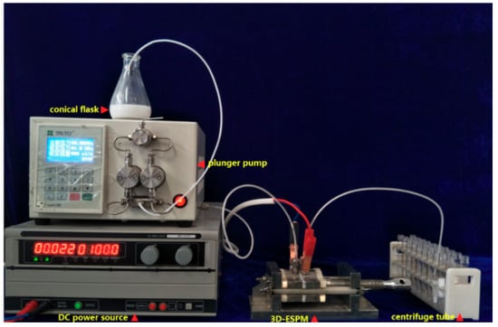 The experimental apparatus is shown in Figure 1, which is composed of a conical flask, a medium pressure piston pump (Flash100, TongTian biotech, Shanghai, China), a direct current (DC) stabilized voltage power supply (MWY-40010, Zhongzheng Equipment, Shenzheng, China), three-dimensional electric spiral plate-type microchannel (3D-ESPM) and effluent collection tubes.