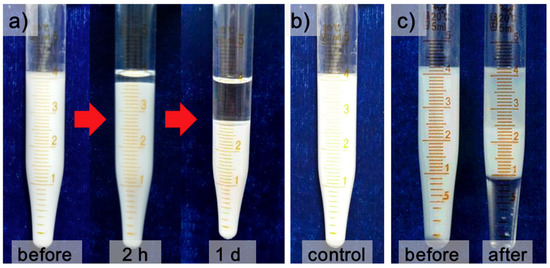 One of two samples of freshly prepared water in kerosene emulsions was settled with gravity for 24 h, and the other one was pumped through 3D-ESPM directly with an electric field intensity of 250 V/cm at the same time. Figure 3a,b show the pictures of emulsions demulsified with gravity settling and 3D-ESPM, respectively.