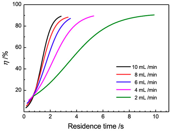 From Figure 7, it is obviously that demulsifying efficiencies increase with the increasing residence time for all five flow rates. Besides this, a special phenomenon is that the intersection points of five curves converge on one point at the residence time of 0.6 s, close to the induction period. Below this point, the demulsifying efficiency at a low flow rate is higher than that at a fast flow rate with the same residence time; this may due to the low shear force at the low flow rate, which is in accordance with the anticipation that droplets coalesce easier at this low flow rate. However, beyond this point, this relationship is reversed, and the demulsifying efficiency at the fast flow rate increases sharply and exceeds that at the low flow rate. This phenomenon suggests an extra demulsification impetus in the 3D-ESPM at a fast flow rate. It is reminiscent of the theory that Dean vortices induced droplet coalescence in the spiral microchannels at the high flow rate [44,45,46]. The intensity of Dean vortices is determined by the Dean number De according to Equations (3) and (4).