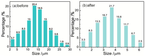 Droplet size distributions of emulsions before and after becoming demulsified with 3D-ESPM were measured by using an optical microscope (UB200i, UOP Photoelectric Technology, Chongqing, China) with an image processing software. The results are shown in Figure 8.