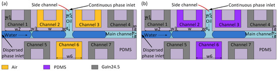 There are two distinct schemes to generate droplets. Figure 1 showed that scheme 1 and scheme 2 had the same design size, while the material-filled-in-Channels 2/3/6 were different. The material-filled-in-Channels 2/3/6 in scheme were PDMS, while that in scheme 2 was air. To form electrodes, Channels 1/4/5/7 were assembled by Ga75.5In24.5 (75.5 wt.% Ga, 24.5 wt.% In, melting point: 15.7 °C; Shanxi Zhaofeng Gallium Co., Ltd., Yangquan, Shanxi, China) via injection with syringe pumps (LSP10-1B, Longer Precision Pump Co, Ltd., Baoding, China). The width w1 and w2 were 70 and 470 µm, separately. Furthermore, the gaps between Channels 1/2/3/4/5/6/7 (w3) were 80 µm. The gaps between Channels 2/3 and the side channel (w4) were 30 µm. Meanwhile, the width of the side channel (w5) and the main channel (w7) were both 60 µm. Moreover, the gap between Channels 1/2/3/4/5/6/7 and the main fluidic channel (w8) were 30 µm. Furthermore, the width of Channels 2/3 (w) and that of Channel 6 (w6) were both 470 µm.