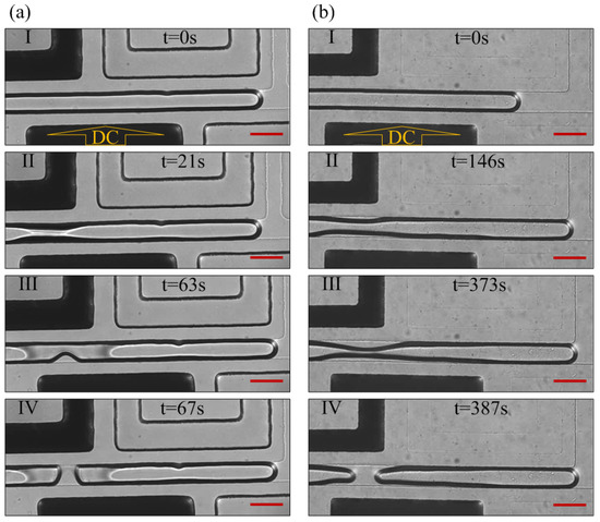 The droplet generation process under 2600 V voltage. (a) Droplet generation process in scheme 1; (b) droplet generation process in scheme 2. Voltage was applied on the electrode marked as “DC” (Channel 5). The scale bars are 100 µm.