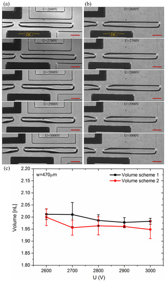 Figure 2 demonstrated that the voltage (2600 V) applied to electrode marked as “DC” induced the meniscus at nearly the same location both in schemes 1 and 2, after the interface was formed. The liquid column was torn into two and generated a droplet around the meniscus place in both schemes. The length of the droplet in the two schemes was almost the same (around 660 µm). Notably, a similar phenomenon also appeared when the voltage changed to 2700, 2800, 2900, and 3000 V. All the experiments under different occasions were performed three times. As shown Figure 3, the pinch-off point was a little closer to the upstream at low voltage, while that shifted further toward downstream at higher voltage. The volume of droplets indicated small differences which could be ignored in scheme 1 and scheme 2 (Figure 3), with the relative error of less than 3%.