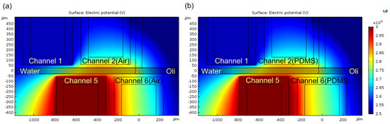 Electric potential distribution of scheme 1 and scheme 2. (a) Electric potential distribution of scheme 1; (b) electric potential distribution of scheme 2. The difference was the filling material of non-electrode Channel 2/6, with air in scheme 1 and PDMS in scheme 2. Three thousand volts was applied on Channel 5.
