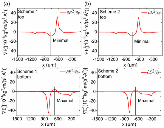 Distribution of near the top wall and bottom wall (at the distance of 2 µm from the top and bottom wall). (a) The distribution in scheme 1; (b) the distribution in scheme 2. The minimal and maximal represented the extreme value, and the droplet generation would be activated at these points, where the DEP force was the greatest off the wall.