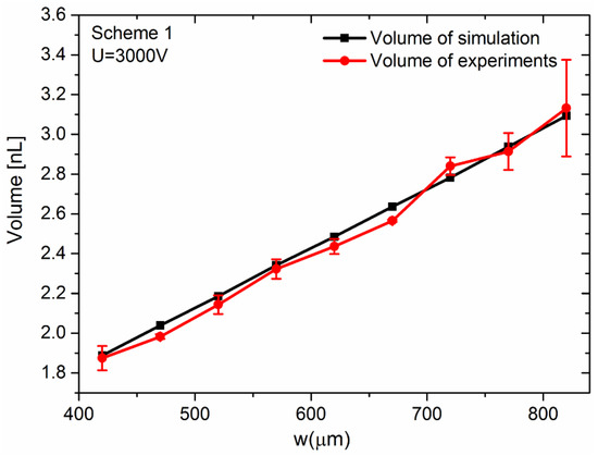 The volume of the droplet in simulation and experiments under the voltage of 3000 V in scheme 1. The w = 420, 470, 520, 570, 620, 670, 720, 770, and 820 µm.