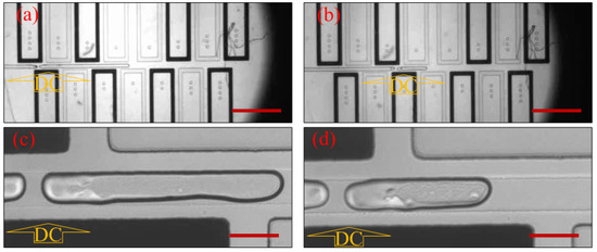 On the other hand, besides designing different value of w to control the droplet size, the droplet volume can also be controlled in a more “dynamic” way. As shown in Figure 7, a series of electrodes can be fabricated in a column beside the main channel in advance. By choosing which pair of electrodes to be electrified, the length and volume of droplet can be easily controlled. As shown in Figure 7, with the fixed interface at the T-junction, when the first pair of electrodes on the left (Figure 6a,c) was electrified, a longer droplet was generated, while a shorter droplet was generated (Figure 6b,d) with the second pair of electrodes being electrified. Thus, the same droplet generator could actively generate droplets with different size by just switching different pairs of electrodes. The applied voltage was 3000 V.