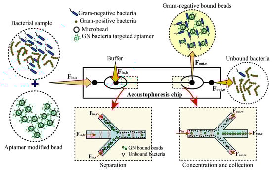 Here, we report a simple and effective method for capturing and displacement of gram-negative bacteria using aptamer-modified microbeads and acoustophoresis. As acoustophoresis allows for simultaneous washing and size-dependent separation in continuous flow mode, we efficiently obtained gram-negative bacteria that showed high affinity without any additional washing steps. The proposed device has a simple and efficient channel design, utilizing a long, square-shaped microchannel that shows excellent separation performance in terms of the purity, recovery, and concentration factor. Microbeads (10 µm) coated with the GN6 aptamer can specifically bind gram-negative bacteria. After incubation of bacteria culture sample with aptamer affinity bead, gram-negative bacteria-bound microbeads, and other unbound/contaminants can be separated by size with high purity and recovery. The device demonstrated excellent separation performance, with high recovery (up to 98%), high purity (up to 99%), and a high-volume rate (500 µL/min). The acoustophoretic separation performances were conducted using 5 Gram-negative bacteria and 5 Gram-positive bacteria. Thanks to GN6 aptamer’s binding affinity, aptamer affinity bead also showed binding affinity to multiple strains of gram-negative bacteria, but not to gram-positive bacteria. GN6 coated bead can capture Gram-negative bacteria but not Gram-positive bacteria. This study may present a different perspective in the field of early diagnosis in bacterial infectious diseases. In addition to detecting living bacteria or bacteria-derived biomarkers, this protocol can be extended to monitoring the contamination of water resources and may aid quick responses to bioterrorism and pathogenic bacterial infections.