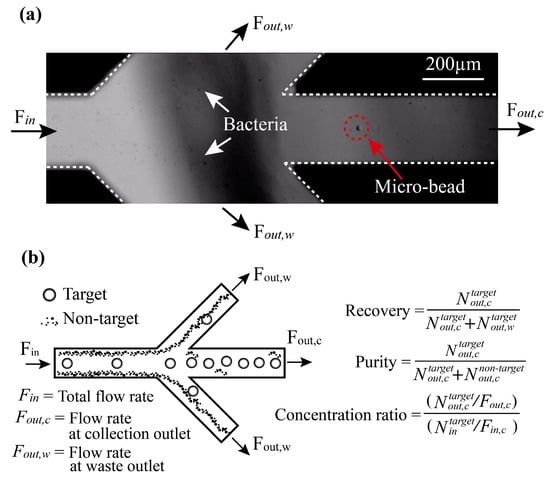 Various microfluidic platforms have been developed to separate bacteria from clinical and environmental samples, including dielectrophoresis, magnetophoresis, bead-based extraction, filtering, centrifugal microfluidics, and methods based on inertial effects and surface acoustic waves (for a comprehensive review, see Wu et al. []). Generally, these methods are limited in terms of sample volume, throughput, recovery of bacteria, the efficiency of cell or lysis debris removal, or the need for specific affinity for pathogen capture []. To improve binding specificity, affinity bead-based cell sorting methods, which utilized affinity micro-bead for capturing and extraction of bacteria have been developed []. The affinity bead-based method generally utilized several physical forces such as acoustic, magnetic, and dielectrophoretic forces to separate the bead bund target from the sample efficiently []. This method can be a powerful tool to separate small particle (<1 µm), such as peptides, viruses, and bacteria since the small size of particles are less affected by the applied physical force for manipulating the particles, and can be extracted using affinity microbeads that bind selectively to the particle of interest [,].