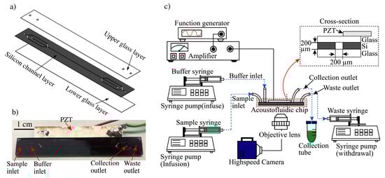 The acoustofluidic device includes a sample inlet, buffer outlet port, main channel, and outlet channel with a collection outlet port and a waste outlet port (Figure 3). The main channel was fabricated in a layered (glass-silicon-glass) format (Figure 3a) with a cross-section of 0.2 × 0.2 mm. An initial borosilicate glass bottom layer (20 mm × 80 mm × 0.5 mm) was bonded to the middle silicon layer (20 mm × 80 mm × 0.5 mm) by anodic bonding. Using a chemical mechanical polishing (CMP) process, 300 µm of the silicon layer was removed so that the size of the middle silicon layer changed to 0.2 mm. This was followed by silicon patterning using a photoresist (SU-8 3010; Nippon Kayaku, Tokyo, Japan) and deep reactive ion etching to form a microchannel with a cross-section of 0.2 × 0.2 mm. The top layer of borosilicate glass (20 mm × 80 mm × 0.5 mm) was sandblasted to form holes as inlets and outlets, and this layer was bonded to the silicon layer through anodic bonding. The 20 × 40 mm piezoelectric transducer (C-213; Fuji Ceramics, Shizuoka, Japan) was glued to the borosilicate glass layer along the microfluidic channel using cyanoacrylate glue (AD100; 3M). The sample inlet and buffer inlet channels had widths of 0.4 and 0.1 mm, respectively. The collection outlet and waste outlet channels had widths of 0.2 and 0.4 mm, respectively. The real picture of the device is displayed in Figure 3b.