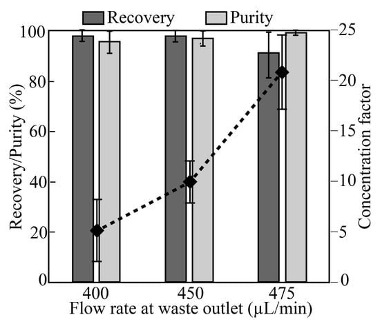 As shown in Figure 2, a mixture of 10- and 1-µm microbeads and bacteria (E. coli KCTC2571) was injected into the acoustofluidic chip, and the separation performance of the chip was evaluated under three different flow conditions. The measured recovery, purity, and concentration factor are shown as a function of the proportion of the number of particles collected at the target outlet compared to the total number of particles collected (at the target outlet and waste outlet; Figure 4) The recovery values were 98% ± 2.1%, 98% ± 2.3%, and 90% ± 9.2%, while the purity values were 97.1% ± 3.1%, 97.8% ± 2.1%, and 99.5% ± 0.4%, respectively. The concentration factors were 5 ± 2.8, 10 ± 1.9, and 20.9 ± 3.9, for volumetric concentrations of 5×, 10×, and 20×, respectively.