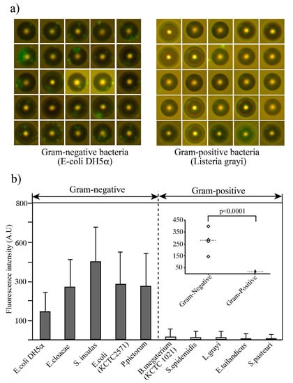After the fluidic operation, the target sample and waste were collected into tubes and the waste outlet syringe, respectively. Samples of 10 µL were taken from the sample collection tubes and dropped onto slide glasses for observation of fluorescence intensity using a fluorescence microscope. The Figure 5a displayed the images of bacteria bound on the beads. A number of gram-negative bacteria (ex. E-coli DH5α was bound on each bead while no or less (one or two) Gram-positive (ex. Listeria grayi) bacteria were bound on the beads. The fluorescence intensity of all bacteria on the beads (>100 beads) was measured using Image J software (NIH; Figure 5). The observation experiments were repeated three times. All five gram-negative bacteria were bound with high affinity. In contrast, significantly reduced binding affinity was observed against all gram-positive bacterial strains tested. Signal intensity was significantly different between gram-negative and gram-positive bacteria (p < 0.0001, t-test).