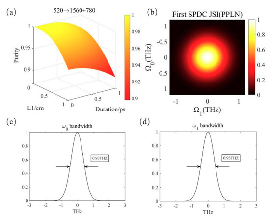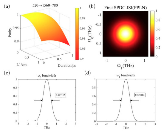 The pump wavelength is 520 nm. Relevant data in the first down-conversion is shown in Figure 2. The z axis in Figure 2a describes the variation of the spectral purity with the parameters. The x-axis represents the range of the selected crystal lengths from 0 to 1 cm while the y-axis is the variation of pump duration in the range of 0–1 ps. The wavelengths of the pair of entangled photons are λ1 = 1560 nm and λ0 = 780 nm. The periodicity of the first PPLN is 38.47 μm. Due to the Gaussian filter with a bandwidth of 0.8 THz, the spectrum purity between photons ω0 and ω1 is almost 1 in the region where the crystal length and pump duration are smaller. Considering the realizability, we selected a pump duration of 100 fs and a crystal length of 0.2 cm.