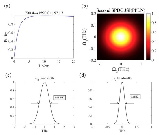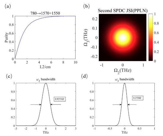 In the second SPDC process, we select the generation wavelengths of λ2 = 1570 nm and λ3 = 1550 nm in consideration of the matching condition of the group velocity. The polarization period of the second PPLN is 88.76 μm. Relevant data are shown in Figure 3. Figure 3a describes the calculation of the spectral purity of photons ω2 and ω3 with the crystal length L2 as the independent variable. It can be seen that with the increase of crystal length, the purity increases to the maximum value of 1. We chose the best crystal length L2 as 9.16 cm. Figure 3b is the joint spectral intensity of photon pair ω2 and ω3. It can be seen that the photon pairs are still frequency uncorrelated in the second SPDC process. As shown in Figure 3c,d, the bandwidth of photons ω2 and ω3 is different because the perfect group velocity match is not achieved, but this does not affect the correlation between them.