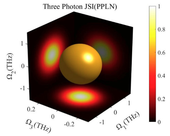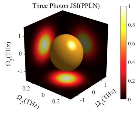 We also produce three photons with a purity of 100%. Due to the material differences, the center wavelengths of the photons ω2 and ω3 are longer than in PPLN. It takes a slightly longer crystal than PPLN to achieve the phase-matching condition. The bandwidth of the photons ω1 and ω2 generated in the PPMgLN is relatively wider. Figure 7 shows the joint spectral intensity of photon triplets generated by cascaded PPMgLN. The three projection planes reflect the correlation between two of the three photons.