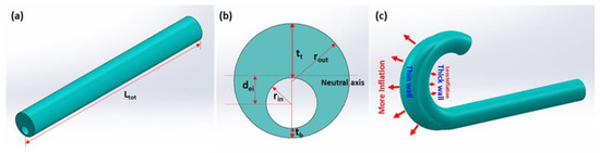 where is the template radius, is the pneumatic pressure, and is the distance between the neutral axis and the void center (Figure 1b). The neutral axis is the particular longitudinal axis that is neither compressed nor extended, and the pneumatic pressure () is applied to the void center. The difference between the operating point of pneumatic pressure and the neutral axis yields the bending moment. Therefore, the increment of thickness difference between the top and bottom tube walls leads to an increase in the distance between the neutral axis and void center (), which is in direct proportion to . Consequently, this triggers the increase of the bending moment that, in turn, enhances the microtube actuator’s deformation.