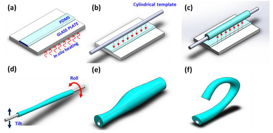 We first prepared a thin layer of LP-PDMS (~3,500 cP in viscosity) and pre-cured it to increase the viscosity (Figure 2a) [38]. Then, we immersed a cylindrical template in the LP-PDMS (Figure 2b) and lifted it to form a tubular PDMS coating around it (Figure 2c). For this step, commercially available polymer wires with diameters of 250 and 470 μm were utilized as the templates. To induce the wall thickness asymmetry, we intentionally tilted and rolled the LP-PDMS coating under in situ thermal curing at 120 °C, inducing the fluidic instability to the LP-PDMS (Figure 2d). Upon completing the curing process, we obtained a multi-segment, shape-varied microtube, which we peeled off from the template with an optical fiber jacket remover.