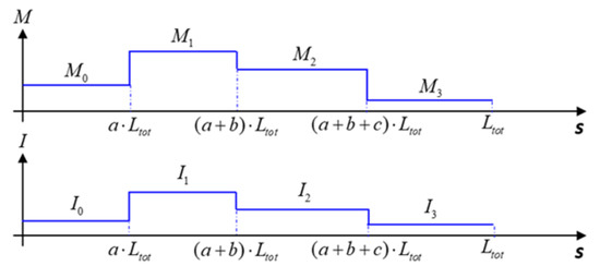 Step-wise distributions of the non-uniform microtube actuator’s bending moment () and second moment of area ( ).