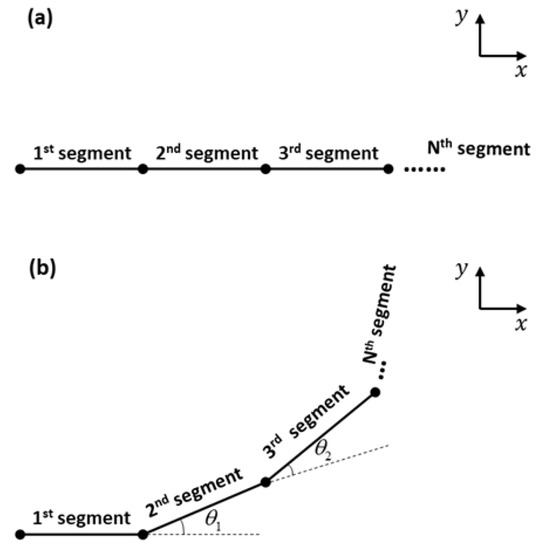 Line-segment method configuration. (a) Initial state of the actuator. (b) Pneumatic pressure applied state of the actuator with bending angle .