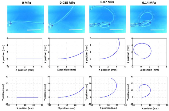 To characterize the microtube actuator’s pneumatic deformation, we used the setup shown in Figure 3. We connected the microtube actuator directly to a pneumatic pump (Pico-Pump, WPI-PV830, World Precision Instruments, Sarasota, FL, USA) to accurately control the inflation. We recorded the resulting bending motion using a camera (Leica DFC-420, Leica Microsystems, Wetzlar, Germany) integrated with an optical microscope (Leica Z16-APO). The structural characteristics of the deformation were extracted through image analysis. The applied pneumatic pressure ranged from 0 to 0.21 MPa, which was sufficient to induce noticeable deformations in the pneumatic microtube actuators. In addition, its motions were recorded through the optical microscope (Supplementary Video S1). Their response time was observed to be in the range of 0.18–0.45 s. Microtube actuators with helical tube-wall thickness variations exhibited torsional motions. Since our current work targets modeling of the microtube actuator’s 2D, planar bending motion, we excluded such samples through visual inspection.