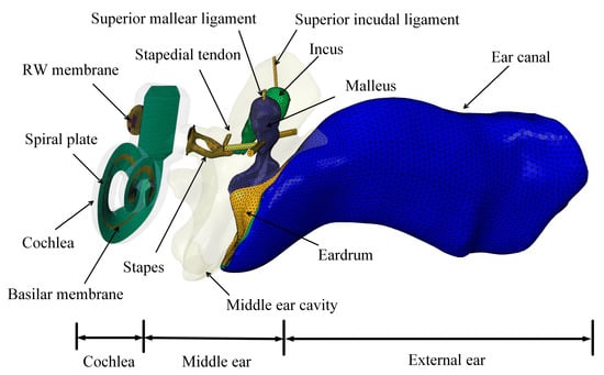 - Zhou, K.; Liu, H.; Yang, J.; Zhao, Y.; Rao, Z.; Yang, S. Influence of middle ear disorder in round-window stimulation using a finite element human ear model. Acta Bioeng. Biomech. 2019, 21. [Google Scholar] [CrossRef]