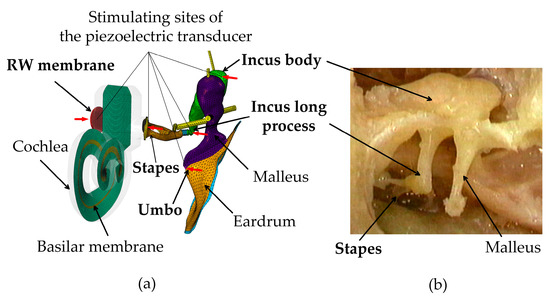 The simulation of the piezoelectric transducer’s simulation. (a) Stimulating sites on the finite element model; (b) the anatomy of the three ossicles (malleus, incus, and stapes).