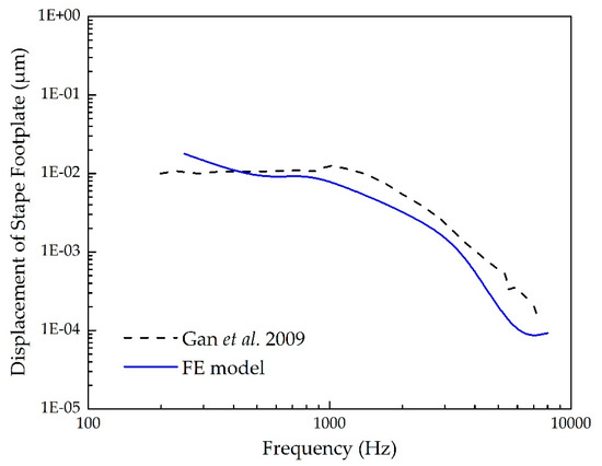 To confirm the validity of the established human ear finite element model, three sets of comparisons with the published experimental data were conducted. Since the stapes response is the input of the cochlea, we firstly selected the stapes’ footplate displacement to verify our model. Figure 4 shows the mean value of experimental measurements on five temporal bones reported by Gan et al. [27]. In this experiment, a set of pure tone sounds of 90 dB SPL were applied to the eardrum, and the displacement of the stapes footplate was measured using a laser vibrometer. For comparison, we carried out a harmonic analysis across the frequency range of 250–8000 Hz under the same sound pressure applied to the lateral side of the eardrum of our FE model. The model-predicted result was also plotted in Figure 4. It demonstrates that our model-derived displacement of the stapes footplate agrees well with the experimental curve.
