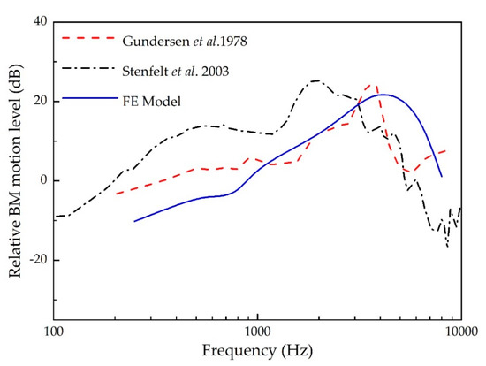 Since the human ear is a complicated biological system with tiny structures and complex geometry, systematic experimental investigation on it is tough to conduct. Considering the finite element method has the advantage of simulating this complicated biological system, many researchers built a human ear FE model, and used it to study the sound transmission properties of the ear [32,33,34,35] and facilitate the design of IMEHDs [14,36,37]. In our human ear FE model, the cochlea was constructed as two fluid-filled channels. This modelling method of the cochlea is widely used in the field of cochlear mechanics [16]. Different individual human ears have similar vibration properties, and to confirm our model’s validity, we compared our model-predicted results with the mean value of the experimental results, which were measured on many human ears, to prove that our model can predict the general response of the human ear. This kind of validation has been widely used by scholars in this fields [20,23].