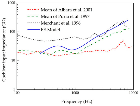 Finally, we compared the model-derived cochlear input impedance, which is a measure to represent the cochlear resistance of transmitted vibration from the middle ear, with the experimental data measured by Aibara et al. [29], Puria et al. [30], and Merchant et al. [31], as shown in Figure 6. The cochlear input impedance was calculated from the ratio of the pressure in the SV to the stapes volume velocity (product of the stapes’ footplate velocity and the stapes’ footplate area). It shows that our predicted result is in the range of these experimental data, and has the same trend with these experimental data, especially the data of Puria et al. [30]. These above comparisons prove that our model can be utilized to predict the sound transmission properties of the human ear.