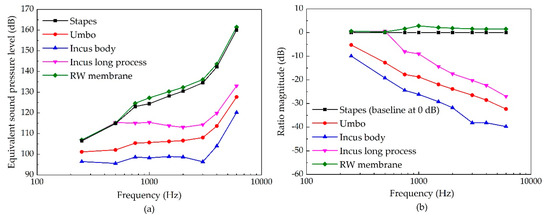 The influence of a piezoelectric transducer’s stimulating sites on its hearing compensation performance. (a) Equivalent sound pressure level of the piezoelectric transducers stimulating at different sites; (b) ratio of equivalent sound pressure of the piezoelectric transducer stimulating at different sites (the reference is the stimulation applied at the stapes along the stapes longitudinal axis).