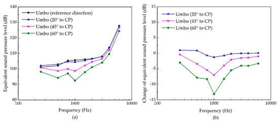 The sensitivity of umbo stimulation due to the change of its excitation’s direction. (a) Equivalent sound pressure level of the piezoelectric transducer’s stimulation; (b) change of equivalent sound pressure level.