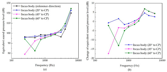 The sensitivity of incus-body stimulation due to the change of its excitation’s direction. (a) Equivalent sound pressure level of the piezoelectric transducer’s stimulation; (b) change of equivalent sound pressure level.