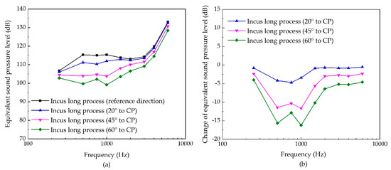 The sensitivity of incus-long-process stimulation due to the change of its excitation’s direction. (a) Equivalent sound pressure level of the piezoelectric transducer’s stimulation; (b) change of equivalent sound pressure level.