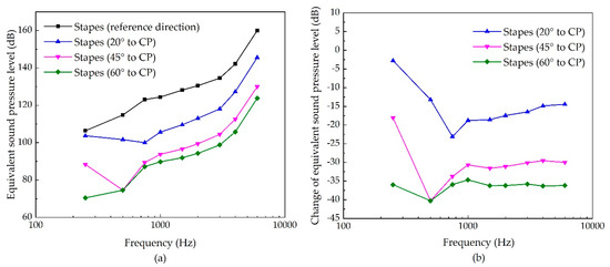 The sensitivity of stapes stimulation due to the change of its excitation’s direction. (a) Equivalent sound pressure level of the piezoelectric transducer’s stimulation; (b) change of equivalent sound pressure level.