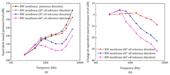 The sensitivity of RW membrane stimulation due to the change of its excitation’s direction. (a) Equivalent sound pressure level of the piezoelectric transducer’s stimulation; (b) change of equivalent sound pressure level.