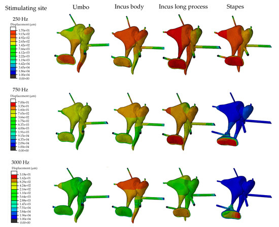 According to the vibrational energy transmission pathway, the implantable middle ear hearing device can be classified as forward stimulation and reverse stimulation [38]. Stimulating the eardrum, the incus body, the incus long process, and the stapes belong to forward stimulation, since their vibration energy are transmitted to the cochlea through the cochlear oval window, which is the same as the normal hearing process. Whereas, stimulating the round window membrane is called reverse stimulation as its vibration energy is transmitted to the cochlea though the cochlear round window, the other opening window of the cochlea. For the forward driving, our results demonstrate that the piezoelectric transducer provides better performance when stimulating the stapes than stimulating the eardrum’s umbo or the incus long process. The performance of stimulating the incus long process is superior to that of stimulating the eardrum’s umbo. This result can be easily predicted for forward stimulation since the stapes is close to the cochlea and therefore more efficient to transmit vibrational energy into the cochlea. Besides, we found that the superiority of the stapes stimulation is significant at high frequencies. To further analyze this phenomenon, we plot the z direction’s (along the longitudinal axis of the stapes) displacement contour plot (Figure 13) of the ossicular chain since the stapes transmits its vibration mainly through its piston motion [39]. Figure 13 shows that the stapes can be efficiently stimulated at a low frequency for all these three stimulating sites, especially for stimulating the stapes and stimulating the incus long process. With an increase in the stimulation’s frequency, the vibration cannot be effectively transmitted to the stapes for stimulating the incus long process and the umbo, especially for stimulating the umbo. This may attribute to the incudomallear joint and the incudostapedial joint, whose viscous behavior become significant at a higher frequency and weaken the vibrational energy transmission from the stimulating point to the stapes.
