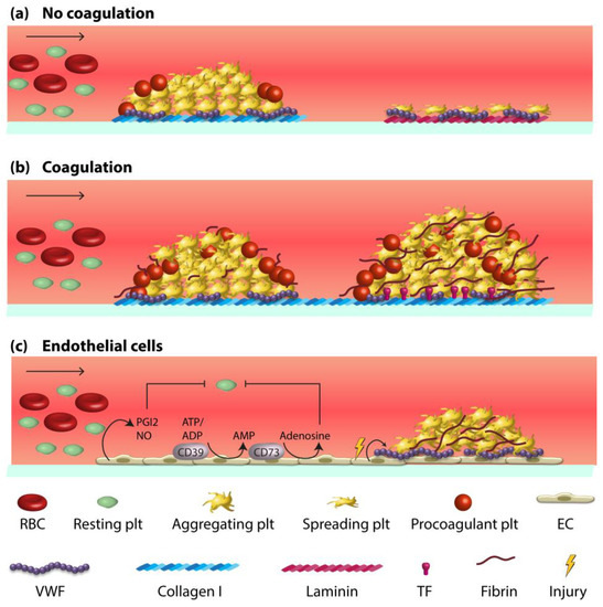 Below we briefly describe key interactions of platelets and coagulant factors with relevant vascular components. For a more extensive discussion on this topic, we will refer to earlier in-depth reviews [7,8]. Under arterial flow conditions, platelets adhere to an exposed subendothelial matrix, enriched in collagen and von Willebrand factor (VWF), before they become activated. Activation and subsequent aggregation of the platelets leads to the formation of a plug or thrombus, as well as in the release of a variety of autocrine substances enforcing this process. A dysfunction in each of these steps may result in impaired thrombosis and/or bleeding phenotype.