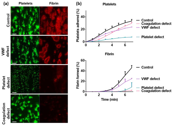 Microfluidic assays under coagulating conditions can be used to study abnormalities in the blood from patients with a genetic or acquired platelet or (anti)coagulation disorder. Common procedures for such investigations are described in Box A3. Deficiencies in a range of coagulation factors and several platelet disorders can be picked up in this way [4,21]. In Figure 3 it is illustrated that a given platelet defect and to a lesser degree a VWF defect results in diminished thrombus and fibrin formation in comparison to the control blood. On the other hand, a severe coagulation defect can lead to abrogation of the fibrin formation.