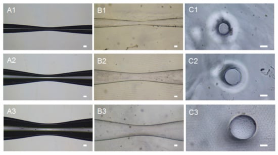 The tapered capillary tubes and engineered microchannels: (A1–A3) Photographs of the tapered capillary tubes; (B1–B3) Photographs of the gelatin chip with microchannels after removing the capillary templates and perfused with distilled water; (C1–C3) Cross-sectional view of the microchannels at the narrowest point. Scale bar, 100 μm.