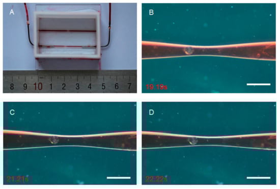 The microchip and liquid transport properties of artificial blood vessel: (A) The microchip perfused with oil red O, showing the liquid transport properties of the microchannel. (B–D) The original (B), expanded (C), and contracted (D) status of the microchannel. Scale bar, 100 μm.