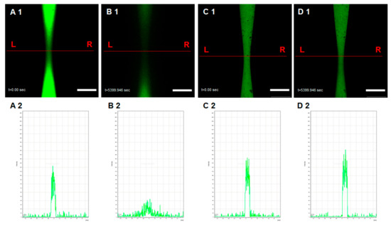 Microchannel permeability assay: (A1,B1) The permeability of microchannel for a micromolecule (A1,B1; FITC-Dextran, 40 kDa); (C1,D1) The permeability of microchannel for biomacromolecule (C1,D1; FITC-Dextran, 500 kDa). (A2–D2) indicate the fluorescence intensity. Scale bar: 500 μm.