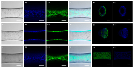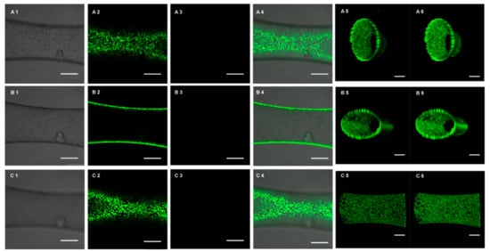 Cytoskeleton and nuclei double staining, showing the endothelialization of microvessel in the microfluidic chips. Confocal fluorescence microscopy images, showing the bottom (A1–A4), cross-section (B1–B4), and top (C1–C4) view of the microvessel within the deformation section of a channel with a smallest diameter of 390 μm. 1 for optical image; 2 for DAPI nucleic acid staining; 3 for Alexa Fluor™ 488 Phalloidin staining; 4 for merged image. Scale bar, 250 μm. 3D reconstruction views of the microvessel with HUVECs (A5–C5, A6–C6). (A5,A6) One side angle view of the microvessel with HUVECs; (B5,B6) Another side angle view of the microvessel with HUVECs; (C5,C6) Side view of the microvessel with HUVECs. (A5–C5) stained by Calcein-AM and PI double staining, (A6–C6) stained by Calcein-AM staining. Scale bar, 200 μm.
