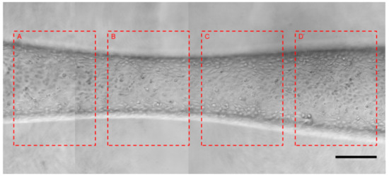 Shear stress caused cell morphology and alignment changes at the bi-conical region: From left to right, (A) Gradual narrowing channel region; (B) Narrowest channel region; (C) Gradual widening channel region; (D) Channel diameter widening to original size. Scale bar, 250 μm. Liquid flow direction, from A to D.