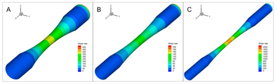 To test the feasibility of applying the microvessel geometries in analyzing hemodynamics and study the generated shear stress, FLUENT software was used to simulate the hydrodynamic changes in vessels of known size with stenosis structure. Three cases were analyzed, as shown in Table 2. Computational shear rate distributions and fluid flow profiles are illustrated in Figure 8. A comparison between different stenotic geometries (i.e., under different pathological conditions) showed a difference in the wall shear rates within and near the stenotic regions (Figure 8A–C). With the chosen volumetric flow rate, the shear rate distribution in the stenosis was similar; that is, the shear rate increased as the microchannel narrowed down. Typical wall shear rates in the stenotic sections of the narrowed vessel (case 1) were in the range of 1000 s−1, while they were in the range of 100 s−1 for the other two cases (cases 2 and 3). When the occlusion percentage increased to over 80% (Figure 8A), the highest shear rates were at 1600~1800 s−1. This means the higher the occlusion percentage, the higher the velocities and, consequently, shear rates.