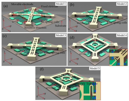 Design models with different thresholds. (a) Movable electrode with six spring coils and fixed electrode with perforated cantilever, (b) four spring coils, (c) three spring coils, (d) movable electrode with three spring coils and a fixed electrode constituted by springs, (e) top view of the location of the fixed electrode shown in (d), (f) additional model with the spring fixed electrode, (g) top view of the fixed electrode shown in (f).