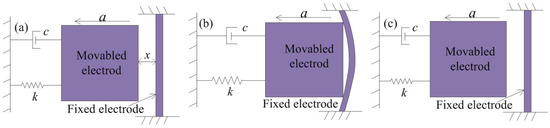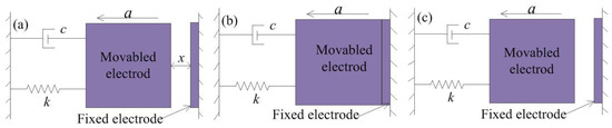 The MEMS inertial switch is an inertial element that can run the external circuit through driving acceleration and is both a sensor and an actuator. The mechanical inertial switch consists of two parts: A movable electrode and fixed electrode. When the inertial switch is impacted by acceleration exceeding the threshold value, the movable electrode moves quickly and contacts with the fixed electrode, and the external circuit is switched on instantaneously. The basic idealized physical model of the model is shown in Figure 2 [17,18], where c is the damping coefficient, a is the acceleration, and k is the elastic coefficient of the suspension spring. The typical contact process is often designed as a rigid contact process due to the limitation of technology conditions. The rigid contact process can be described as follows: