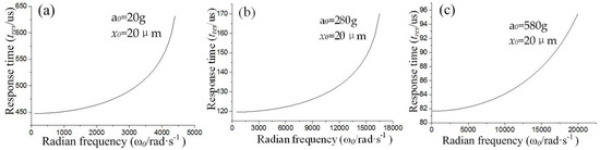 According to Equation (6), the response time is determined by the inherent frequency () and acceleration peak value (a0), and the gap (x0) between electrodes is a constant. The relation curves between the response time (tre) and acceleration (a0), and inherent frequency (), are shown in Figure 3.